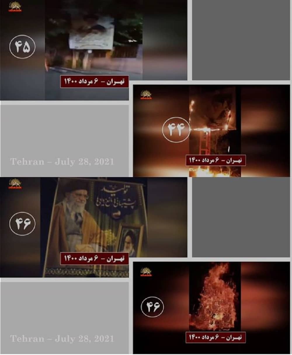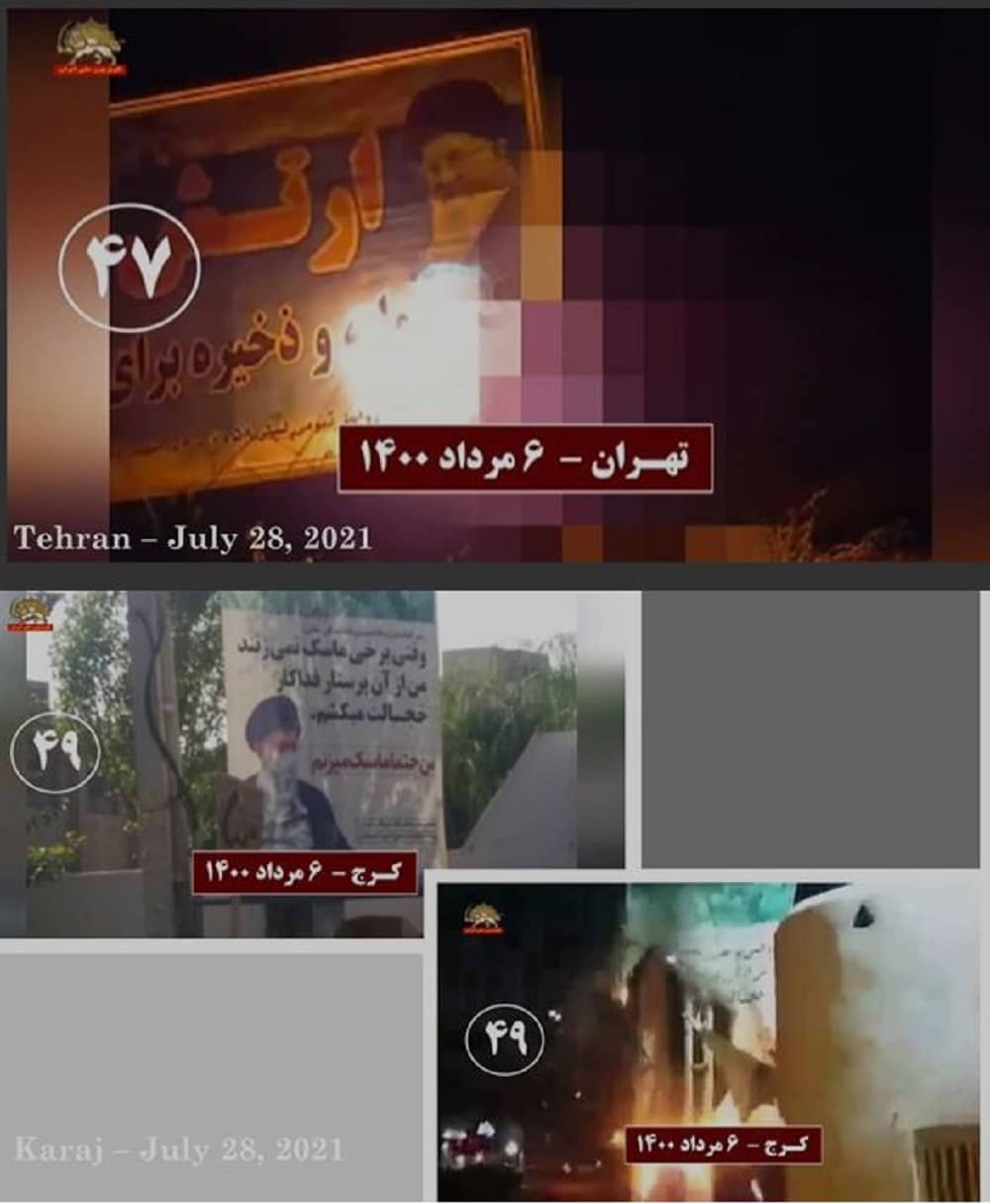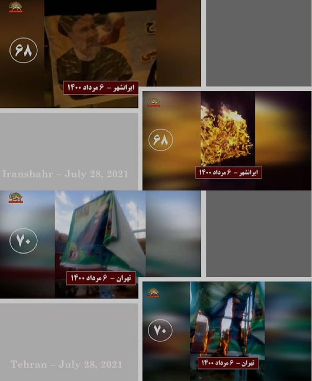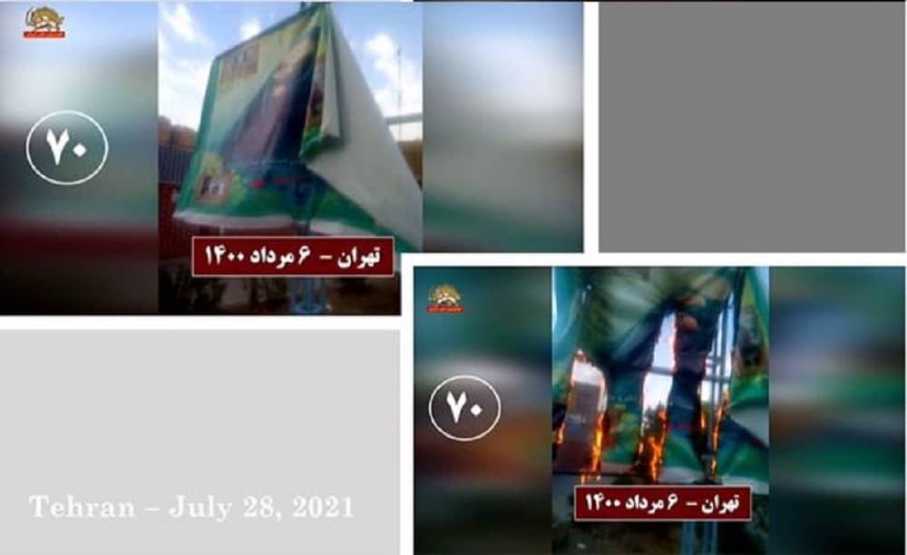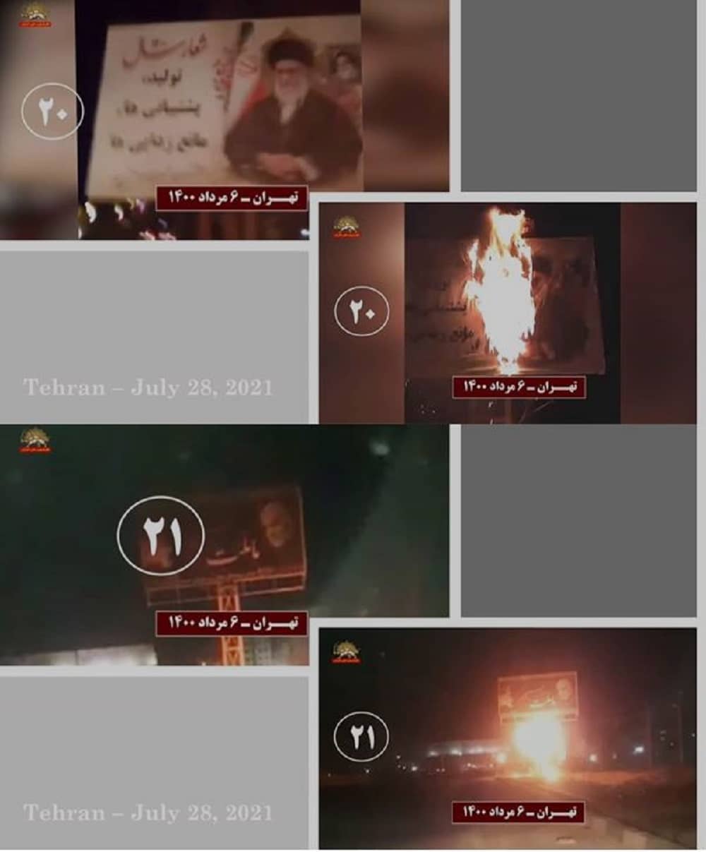 Të mërkurën më 28 korrik 2021, në solidaritet me kryengritjen e banorëve të zemëruar të Khuzestan e qyteteve të tjera të Iranit, të rinjtë e rebeluar dhe mbështetësit e Mojahedin-e Khalq (MEK/PMOI) në Teheran e qytete të tjera u vunë zjarrin fotografive të Khamenei, Qassem Soleimani, komandantit të eliminuar të forcave terroriste Quds, dhe Ebrahim Raisi, presidentit të zgjedhur të regjimit, i cili njihet si ekzekutuesi i masakrës së 1988-ës.