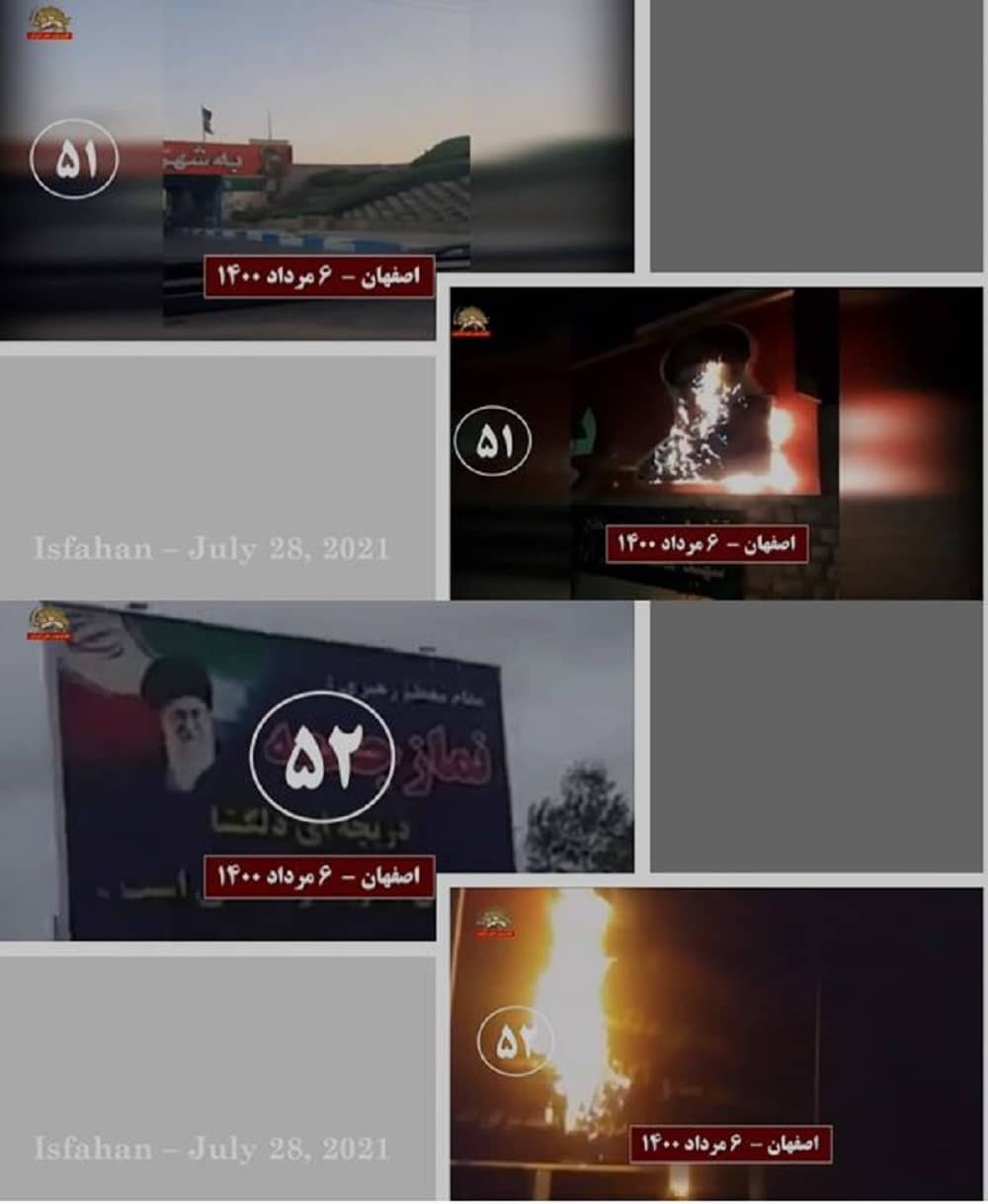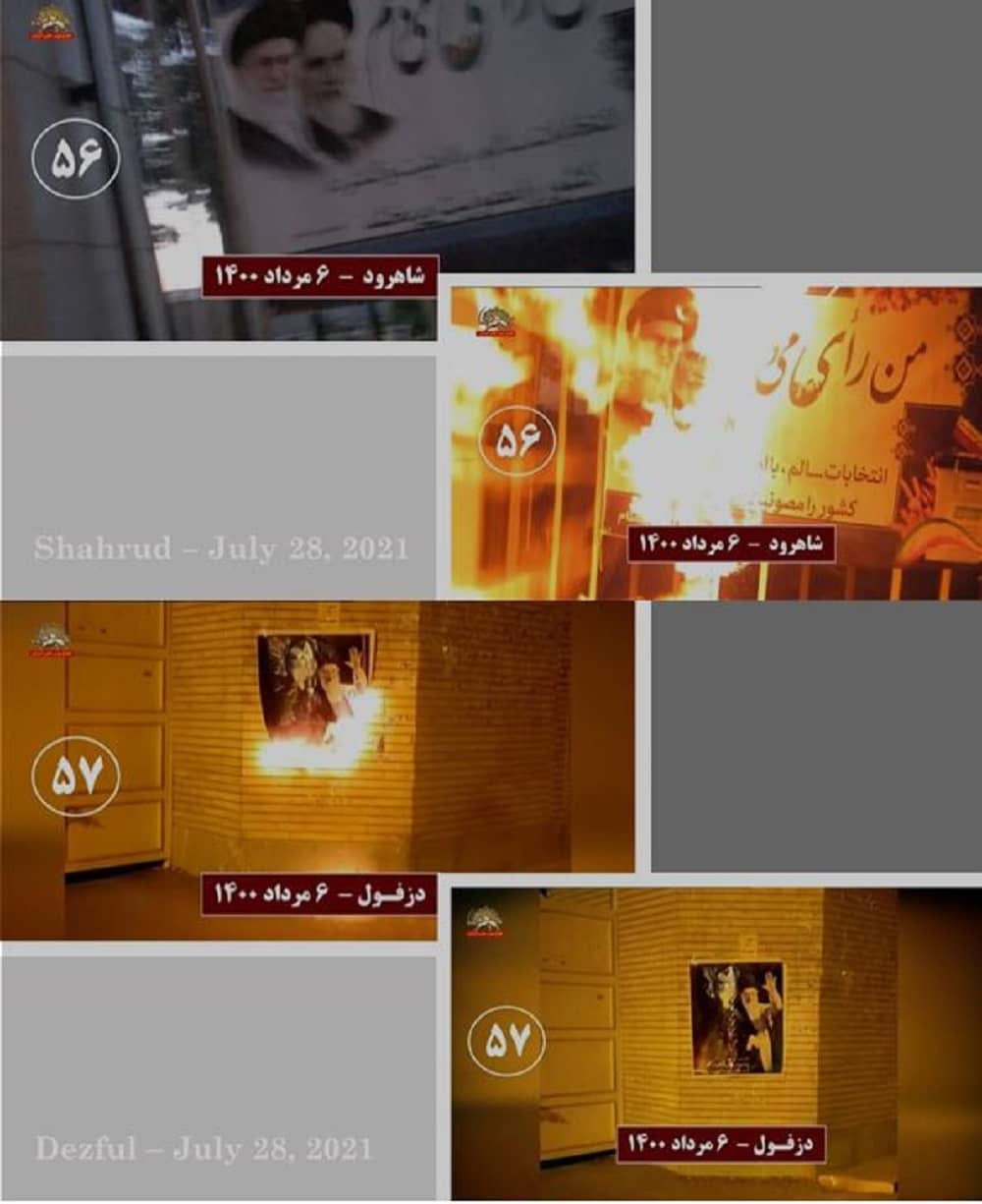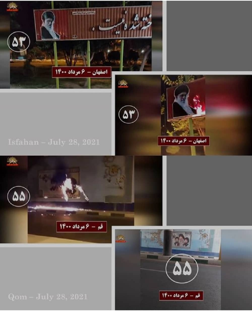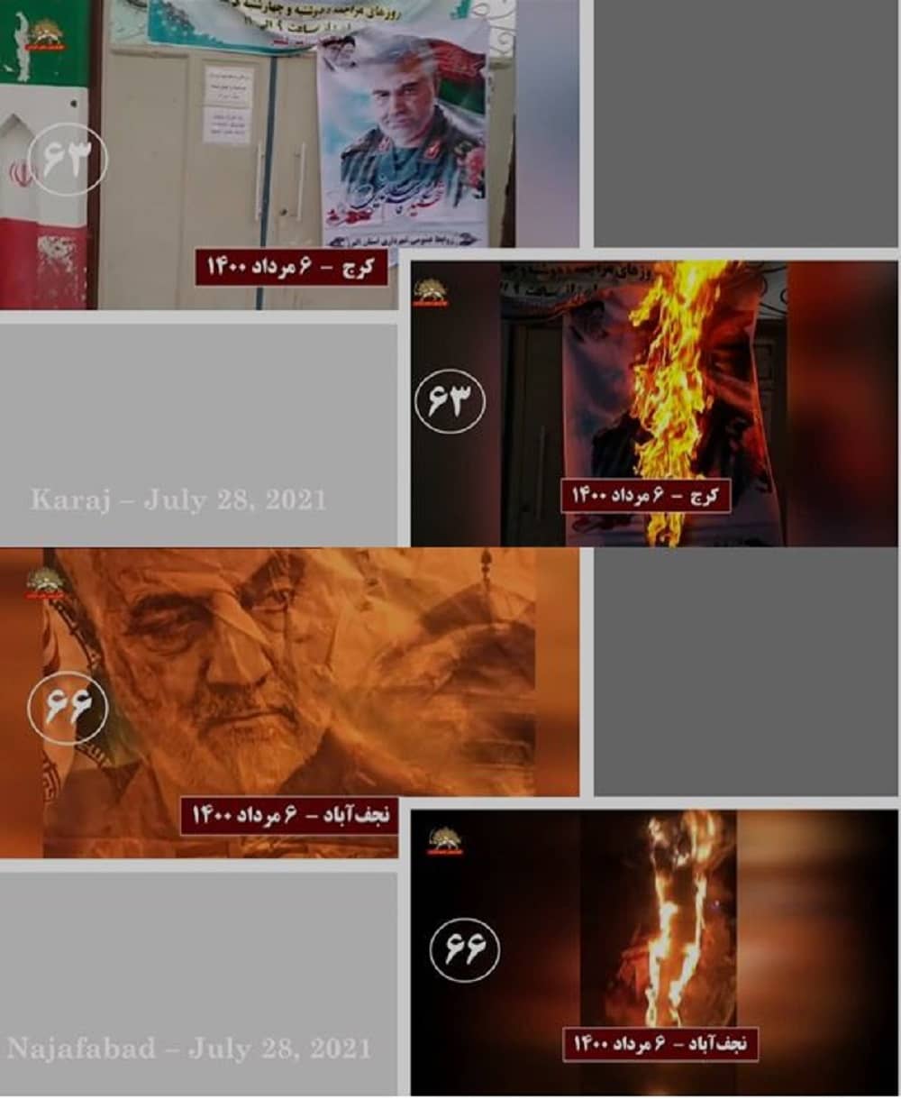 Të mërkurën më 28 korrik 2021, në solidaritet me kryengritjen e banorëve të zemëruar të Khuzestan e qyteteve të tjera të Iranit, të rinjtë e rebeluar dhe mbështetësit e Mojahedin-e Khalq (MEK/PMOI) në Teheran e qytete të tjera u vunë zjarrin fotografive të Khamenei, Qassem Soleimani, komandantit të eliminuar të forcave terroriste Quds, dhe Ebrahim Raisi, presidentit të zgjedhur të regjimit, i cili njihet si ekzekutuesi i masakrës së 1988-ës.