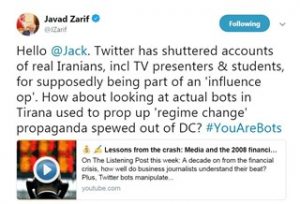 Agjencia shtetërore e lajmeve ISNA e pati cituar ambasadorin e regjimit në Londër, Saeed Baeidinejad, më 16 shtator 2018, tek thoshte se MEK “prodhon miliona mesazhe në formën e hashtag-eve subversive çdo ditë, duke përdorur teknologjitë më të avancuara të informacionit.” Ai i bënte thirrje Twitter-it që ta “ndjekë kërkesën zyrtare të Dr. Zarif për t’i mbyllur llogaritë e rreme që dërgojnë hashtag-e subversive kundër Iranit.”