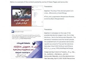 Tani, të gjendur përballë raportit hetimor të Threadstone71 dhe skandalit madhor lidhur me fushatën kibernetike të regjimit iranian kundër Samitit Global Irani i Lirë më 17 korrik 2020, lobi që mbështet mullahët ka cituar “Raportin e Marsit 2021 mbi Sjelljet e Koordinuara Jo Autentike” të Facebook mbi 11 shtete, raport i cili mbështetet fuqishëm në mbulimet e mëparshme negative të mediave ndaj MEK-ut, mbulime mediatike të cilat kanë si burime agjentët e inteligjencës të regjimit iranian, dhe ka vënë në dukje në mënyrë qesharake “shkeljet” e MEK në Shqipëri, duke pretenduar se ata janë përfshirë në veprimtari të padëshirueshme për të ndikuar tek situata politike në Iran!