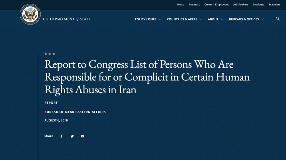 Raporti i Departamentit të Shtetit të SHBA-së, i datës 6 gusht 2019, thotë se në përputhje me autoritetet e deleguara tek Sekretari i Shtetit në E.O. 13553, që implementon Seksionin 105 të Sanksioneve Gjithëpërfshirëse mbi Iranin. Më poshtë gjendet një link që të çon në listën e individëve dhe entiteteve që janë përcaktuar nga Sekretari i Thesarit, në konsultim me Sekretarin e Shtetit apo me rekomandimin e tij, se plotësojnë kriteret në Seksionet 105(b) dhe 105B(b) të CISADA.